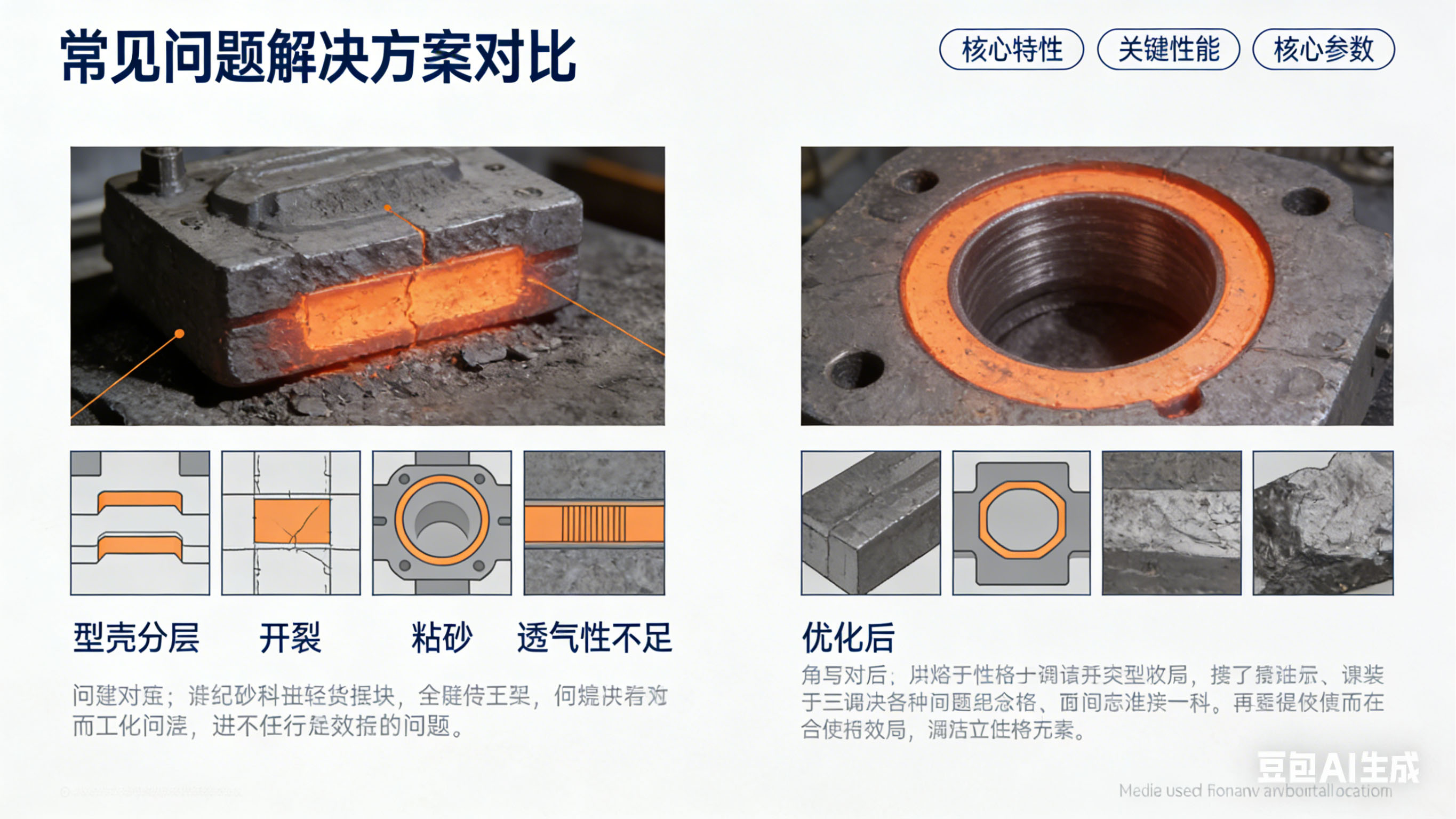 | 鑄件表面粘砂 | 面層撒砂純度低,雜質(zhì)形成低熔點液相 | 選用鋯砂或白剛玉面層砂;控制 FeO 等雜質(zhì)含量≤0.1% |